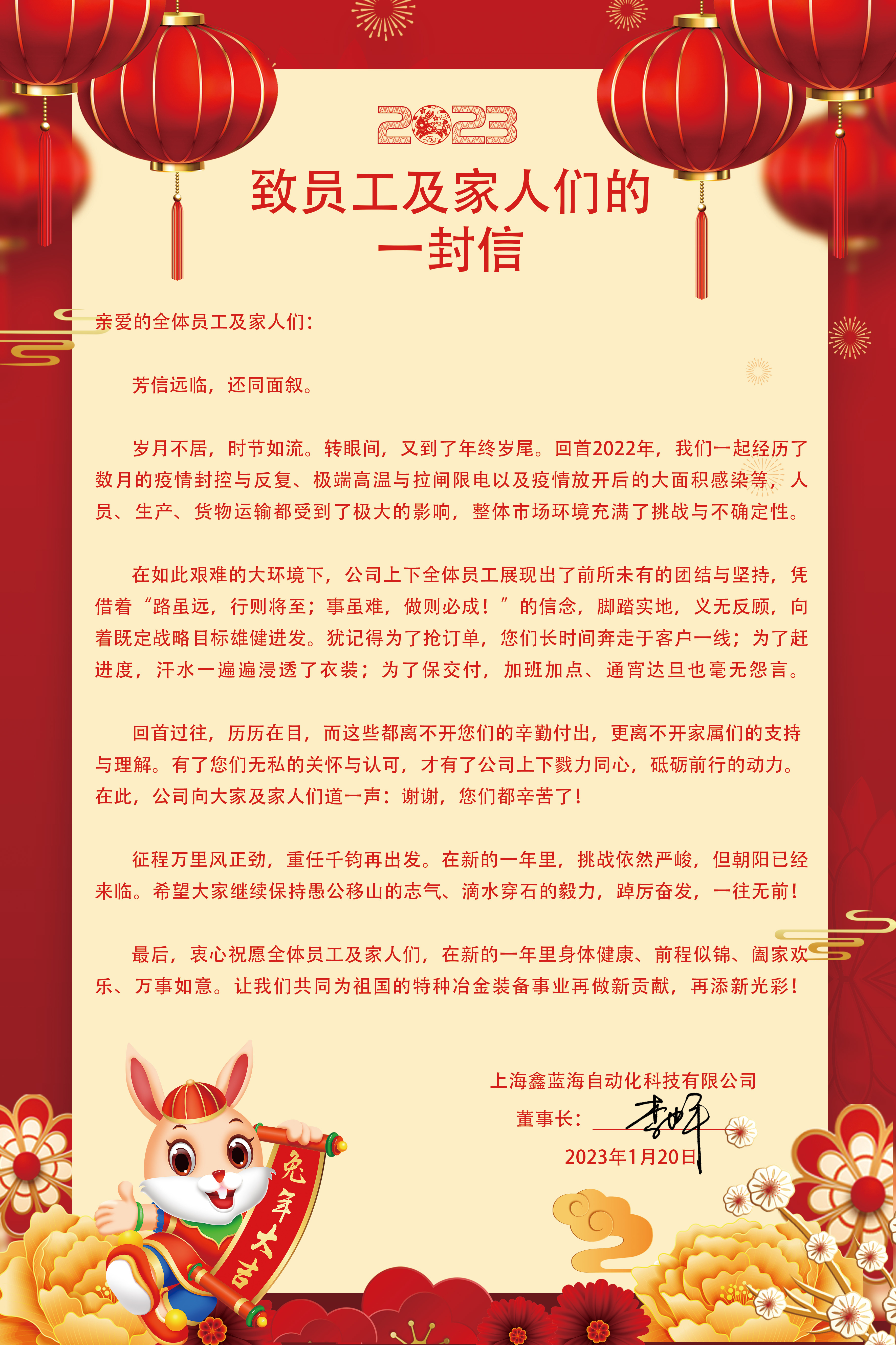 致鑫藍海全體員工及家人們的一封信,請查收!