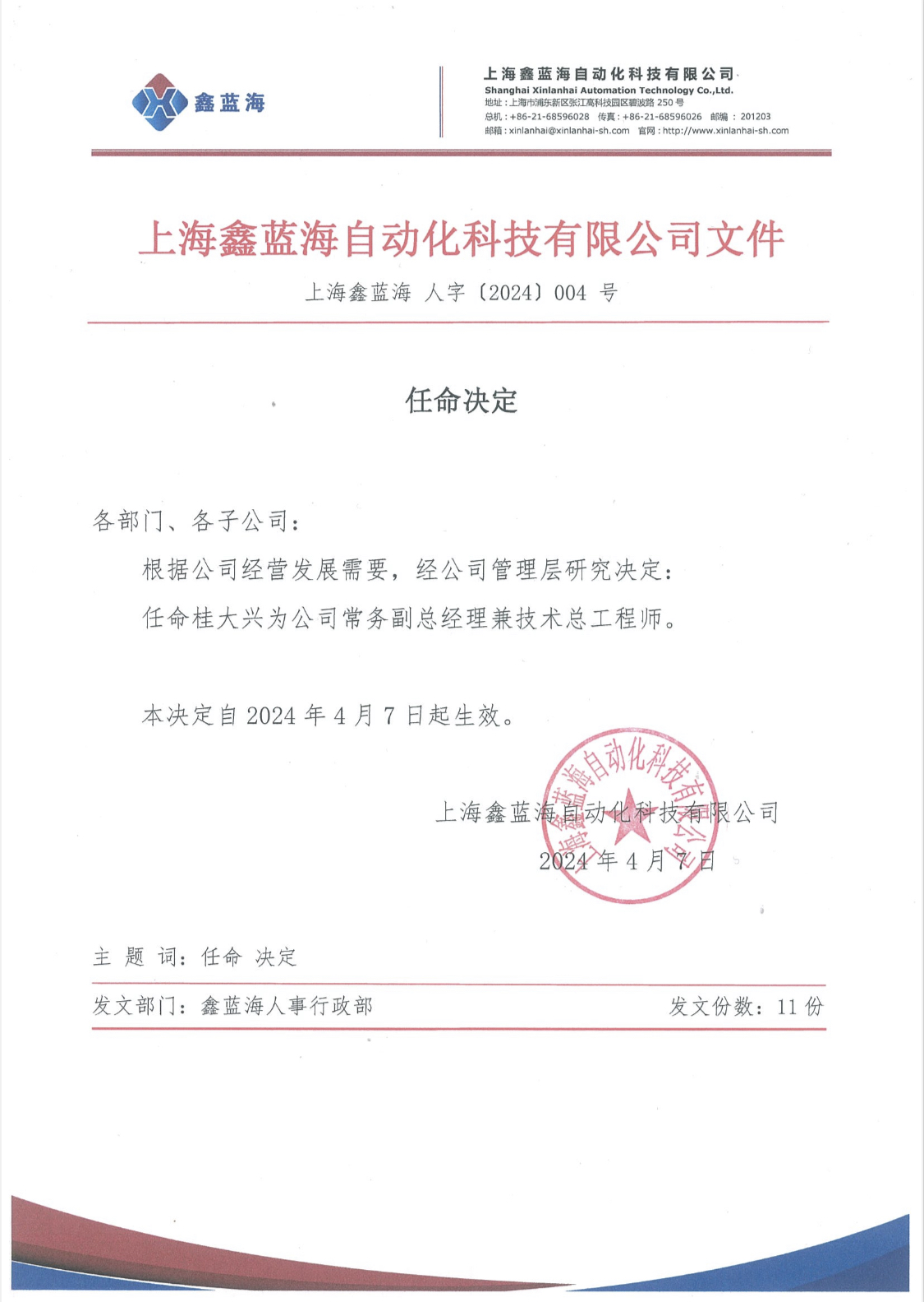 上海鑫藍(lán)海任命決定